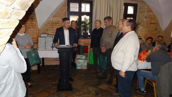 w naradzie połączonej ze spotkaniem wigilijnym udział wzięli przedstawiciele lokalnych władz samorządowych, emerytowani pracownicy nadleśnictwa, Małgorzata Wójcik – dyrektorka placówki Domu Dziecka „Wiosna” w Krzydlinie Małej, ks. Dziekan Jarosław Olejnik, Marek Wiśniewski oraz Jacek Zygmunt - redaktorzy odpowiedzialni za powstanie Monografii Nadleśnictwa Wołów.