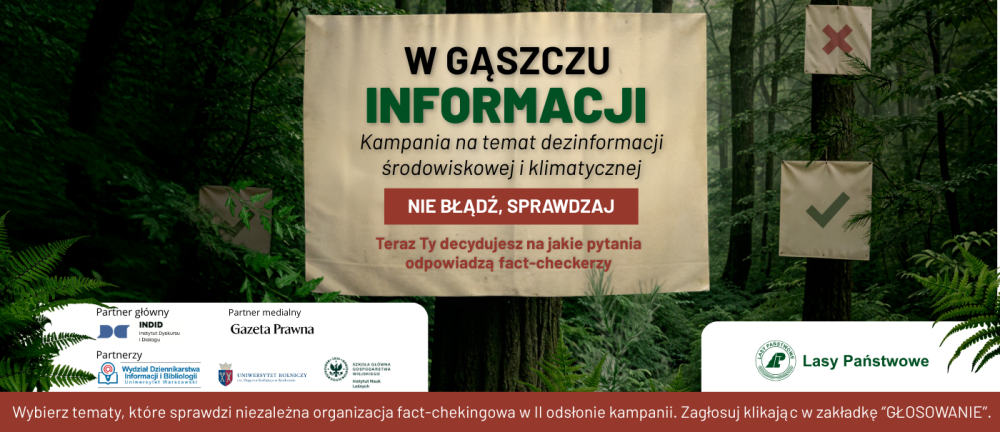 Lasy Państwowe zakończyły pierwszy etap ogólnopolskiej kampanii edukacyjnej „W gąszczu informacji. Nie błądź! Sprawdzaj”! poświęconej dezinformacji w środowisku przyrodniczym i jej wpływie na klimat. To pierwsza tego typu kompleksowa kampania w Polsce. Teraz, zgodnie z zapowiedziami, czas na drugą odsłonę. O tym na jakie pytania odpowiedzą fact- checkerzy Instytutu Dyskursu i Dialogu zdecydują internauci.